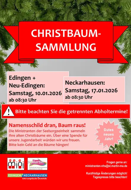 Christbaumsammlung in Edingen und Neu-Edingen am Samstag, 10. Januar, ab 8.30 Uhr  Namensschild dran, Baum raus! Die Ministranten der Seelsorgeeinheit und die KjG Neckarhausen sammeln ihre alten Christbäume ein. Über eine Spende für die Jugendarbeit würden wir uns freuen. Bitte kein Geld an die Bäume hängen! Fragen gerne per E-Mail an: ministranten-nhs@st.martin-ma.de