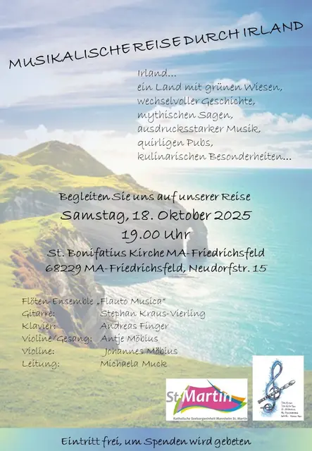 Das Flötenensemble "Flauto Musica" des Flötenkreises St. Bonifatius lädt ganz herzlich am Samstag den 18. Oktober 2025 um 19.00 Uhr zu einer musikalischen Reise durch Irland in der St. Bonifatius Kirche ein.