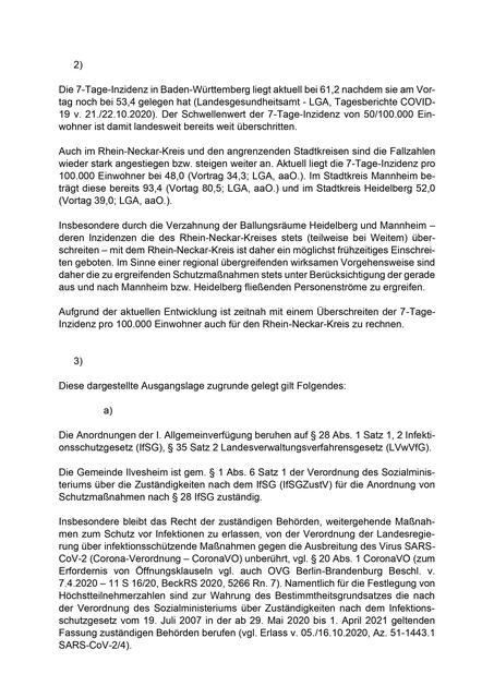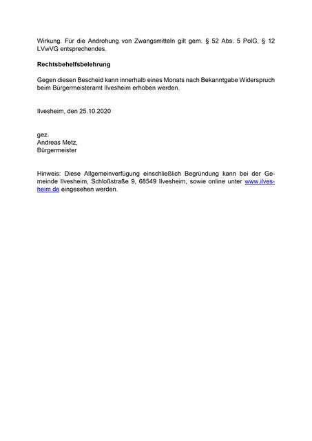 Allgemeinverfügung der Gemeinde Ilvesheim zur Umsetzung weiterer Maßnahmen zur Eindämmung der Atemwegserkrankung COVID-19 und Verhinderung der Ausbreitung des Coronavirus SARS-CoV-2.