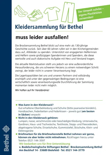 Leider muss die evangelische Kirchengemeinde mitteilen, dass die Kleidersammlung für Bethel von der "Brockensammlung Bethel" für das Jahr 2025 kurzfristig abgesagt wurde. Die Sammlung hätte vom 13.-17. Oktober 2025 im Gemeindehaus stattfinden sollen.