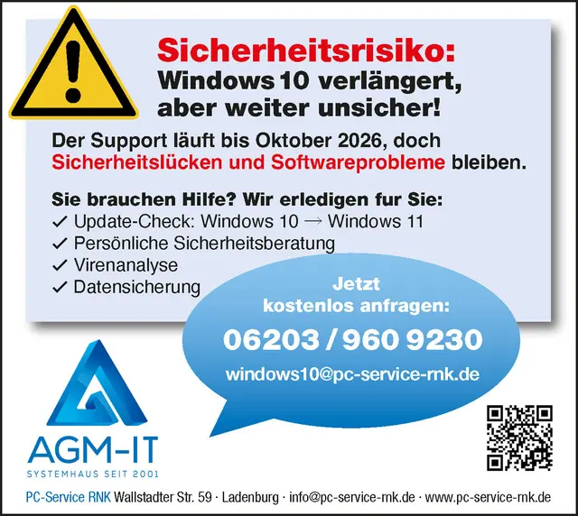 Günter Müller, Head of IT, warnt eindringlich: „Rund 40 bis 50 Prozent der Rechner laufen noch mit Windows 10. Nach Ablauf der Frist ohne Sicherheitsupdates weiterzuarbeiten, ist schlicht fahrlässig! Das ist wie Autofahren ohne Bremsen und Airbags – es mag gehen, aber sicher ist das nicht.“ Viele ältere Rechner sind nicht updatefähig. In solchen Fällen berät AGM-IT, ob neue Hardware nötig ist oder wie man die verbleibende Zeit sicher überbrückt.