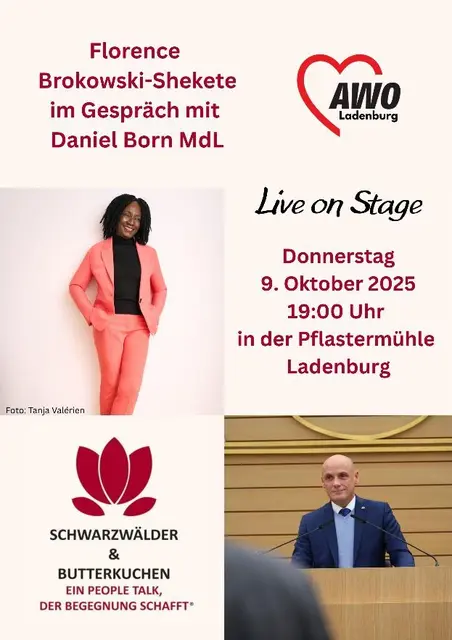 Die AWO Ladenburg lädt am Donnerstag, 9. Oktober 2025 um 19:00 Uhr in die Pflastermühle Ladenburg zu einem besonderen Abend im Rahmen der Gesprächsreihe SCHWARZWÄLDER & BUTTERKUCHEN – live on Stage ein. Unter dem Titel „Fehlerkultur statt Fallstricke – Politik im Dialog“ führt Talk Gastgeberin, Kommunikationsexpertin und SPIEGEL-Bestsellerautorin Florence Brokowski-Shekete durch den Abend.