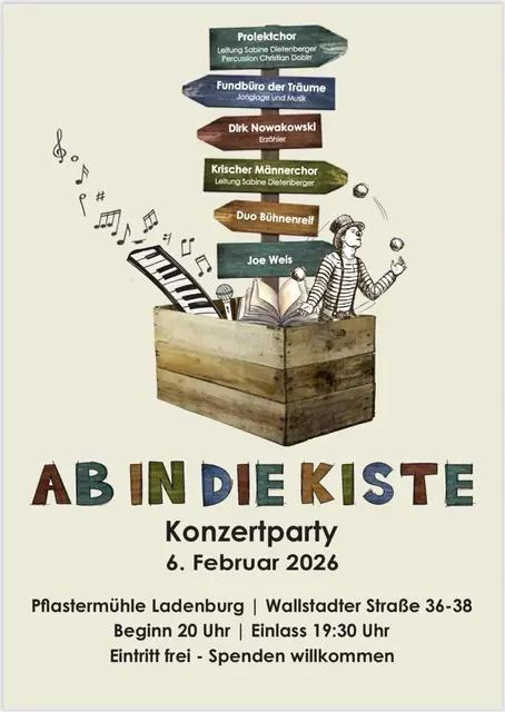 Unter dem vielversprechenden Motto ‚Ab in die Kiste‘ laden Sabine Dietenberger und ihr Pro!ektchor zu einer kunterbunten Konzertparty in die Pflastermühle ein. Die Frauen und Männer des im September 2025 neu gegründeten Chors ( LAZ, RNZ und MM berichteten) freuen sich riesig auf ihren ersten gemeinsamen Auftritt am Freitag, dem 6. Februar 2026. Da gibt es viel Fetziges und auch besinnliches ‚auf die Ohren‘ – und das nicht nur vom Pro!ektchor. Der Chor hat Gäste eingeladen, die für weiteren...