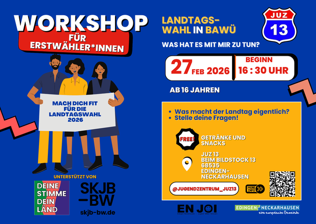 Du bist unter 18 und willst zeigen, welche Themen dir wichtig sind? Dann komm zur U18-Wahl im Jugendzentrum (JUZ 13)! Hier kannst du an einer simulierten Bundestagswahl teilnehmen und erfahren, welche Parteien deine Interessen am besten vertreten. Vor Ort wirst du über die Wahl informiert. Im Anschluss hast du die Möglichkeit, in einer Podiumsdiskussion mit Politikern lokaler Parteien deine Fragen zu stellen und mit ihnen ins Gespräch zu kommen. Zum Abschluss gibt es Pizza & Getränke, um in...