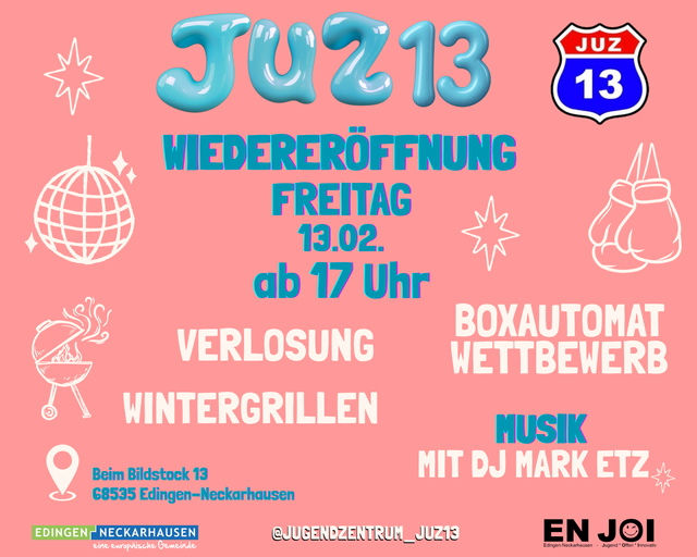 Das Jugendzentrum JUZ 13 ist wieder da – und das wollen wir gemeinsam feiern! Am Freitag, 13.02.2026, öffnet das JUZ 13 ab 17.00 Uhr wieder seine Türen und lädt Jugendliche und junge Erwachsene dazu ein, das „neue“ JUZ 13 kennenzulernen, abzuhängen und einfach eine gute Zeit zu haben. In den letzten Wochen hat sich im JUZ 13 einiges getan. Gemeinsam mit Jugendlichen und mit viel Unterstützung durch den Bauhof wurden die Räume neu gestaltet. Das Jugendzentrum ist jetzt einladender, cooler und...