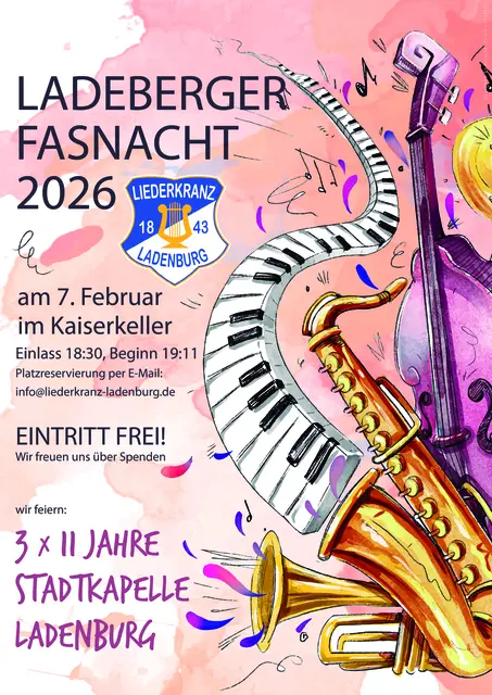 Am Samstag, den 7. Februar 2026, lädt der GV Liederkranz 1843 e. V. Ladenburg herzlich zur Ladeberger Fasnacht in den Kaiserkeller ein. Auch in diesem Jahr wird dort ein närrisches Ladenburger Jubiläum gefeiert. Mit dem Motto „3 × 11 Jahre Stadtkapelle Ladenburg“ erwartet die Besucherinnen und Besucher ein abwechslungsreiches Fasnachtsprogramm mit tänzerischen Darbietungen, Büttenreden und natürlich viel Musik – live auf der Bühne sowie im Anschluss bei der närrischen Party. Freuen Sie sich auf...